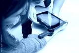 dermatologist examines moles on a female patient's arm with a dermatoscope and a computer tablet. Prevention of melanoma.
