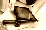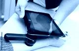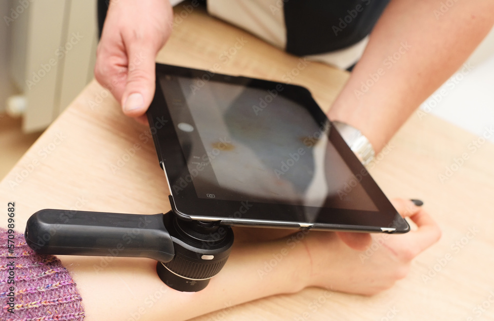 dermatologist examines moles on a female patient's arm with a dermatoscope and a computer tablet. Prevention of melanoma.