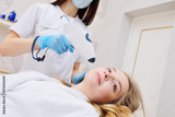 procedure of hardware skin rejuvenation using a cold stream of carbon dioxide CO2. A cosmetologist performs a skin rejuvenation procedure for an attractive woman