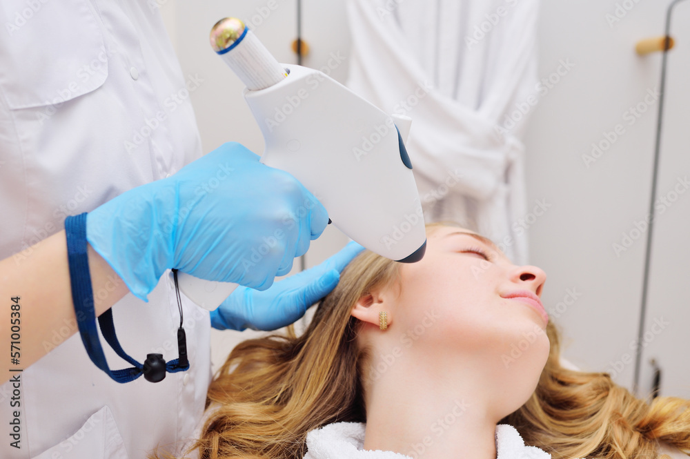procedure of hardware skin rejuvenation using a cold stream of carbon dioxide CO2. A cosmetologist performs a skin rejuvenation procedure for an attractive woman