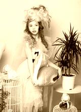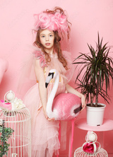 Adorable seven years old child girl in a fairy costume and make-up holding a flamingo, pink tones, fairy tale