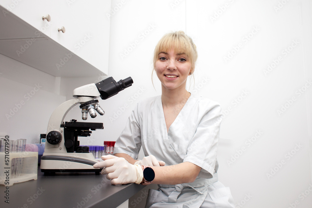 portrait of a medical laboratory worker in uniform at the workplace, a young girl doctor sits in the laboratory