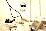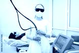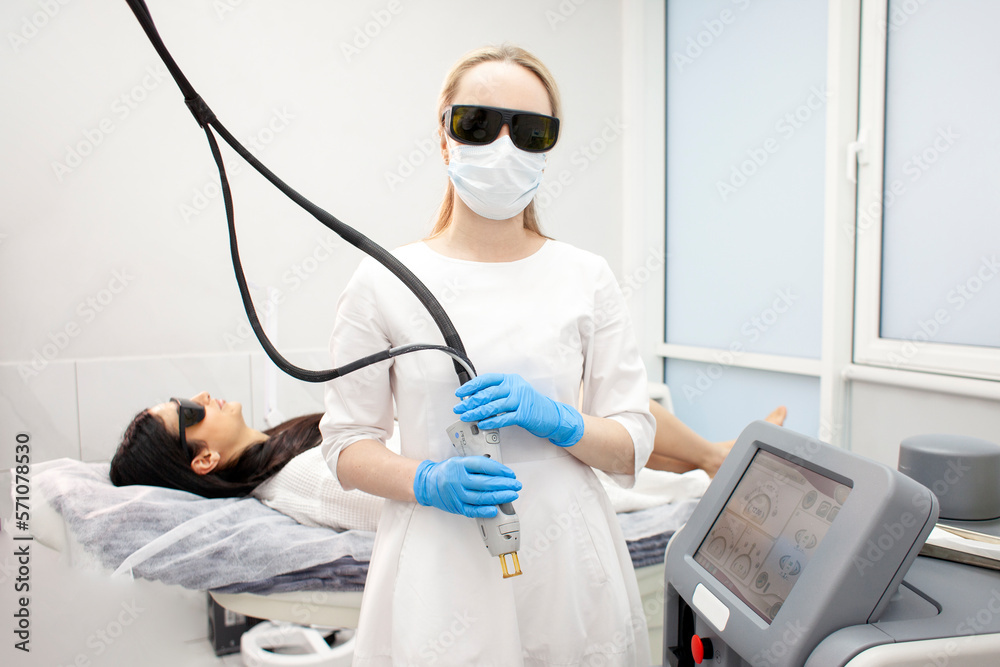 doctor cosmetologist stands in a cosmetology clinic and holds an alexandrite laser, girl dermatologist with equipment
