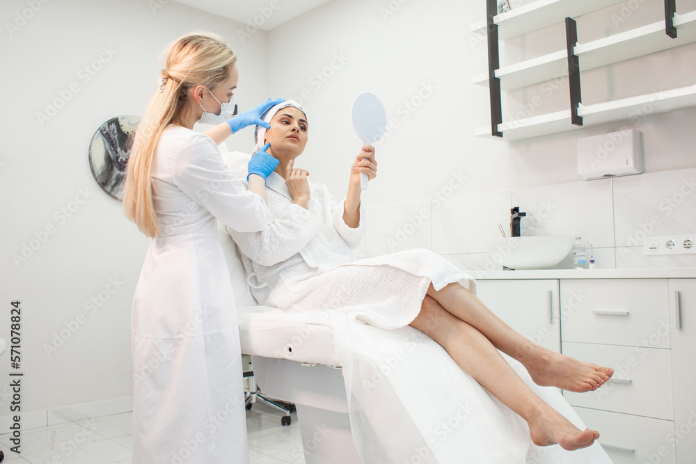 girl sits at an appointment with a cosmetologist in cosmetology clinic, dermatologist examines the skin