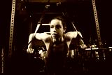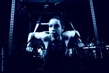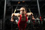 young sports girl in red sportswear is training with elastic bands in a black gym, an attractive woman is doing sports