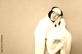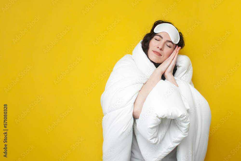 young woman in sleep mask covers herself with white fluffy soft blanket and sleeps on yellow background