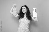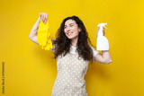 young cute girl cleaner in apron holds cleaning agent and gloves on yellow background and smiles