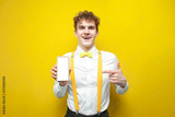 young cheerful guy in bow tie and suspenders shows blank smartphone screen on yellow background