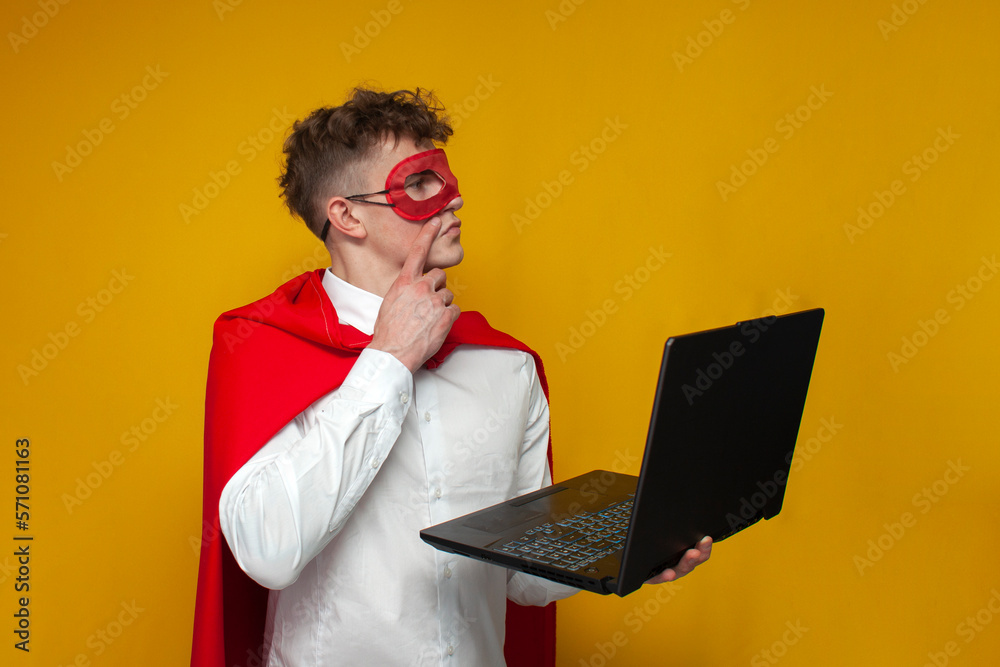 guy in a superhero costume uses a laptop on a yellow background and thinks, a worker superman dreams