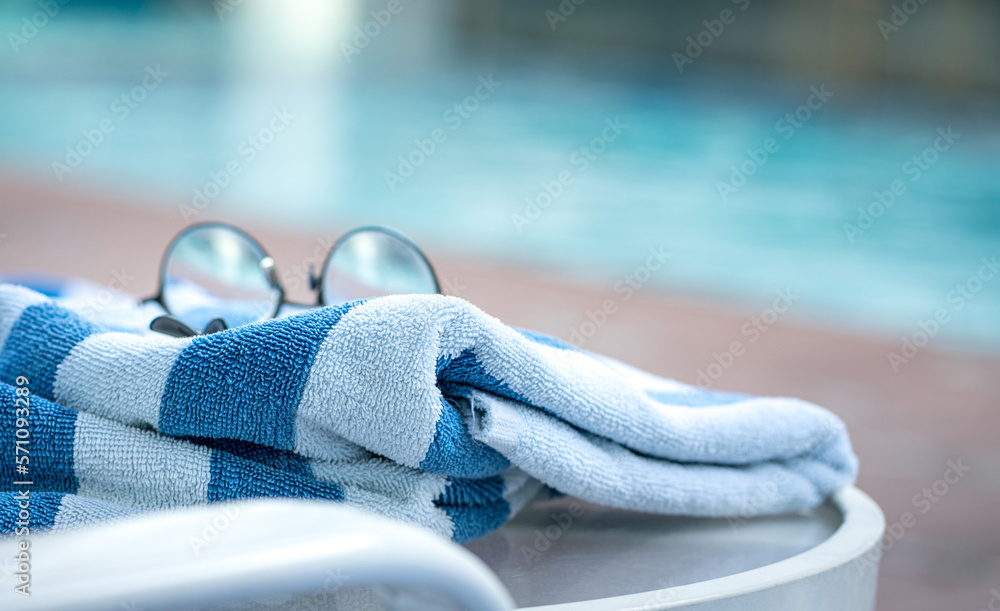 Pool towel on lounge chair with eyeglasses and pool background. Summer vacation concept.