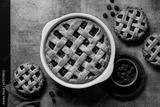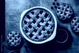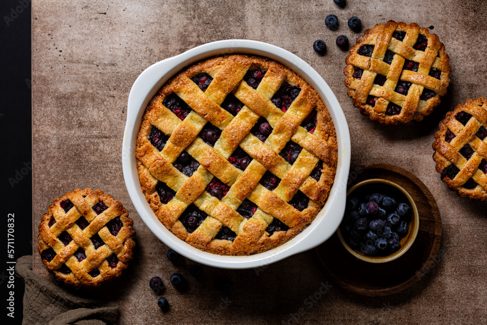 Brawn table with homemade bakery. Whole baked mixed berry crust pie or tart with lattice, mini tarts. Fresh berries. Top view.