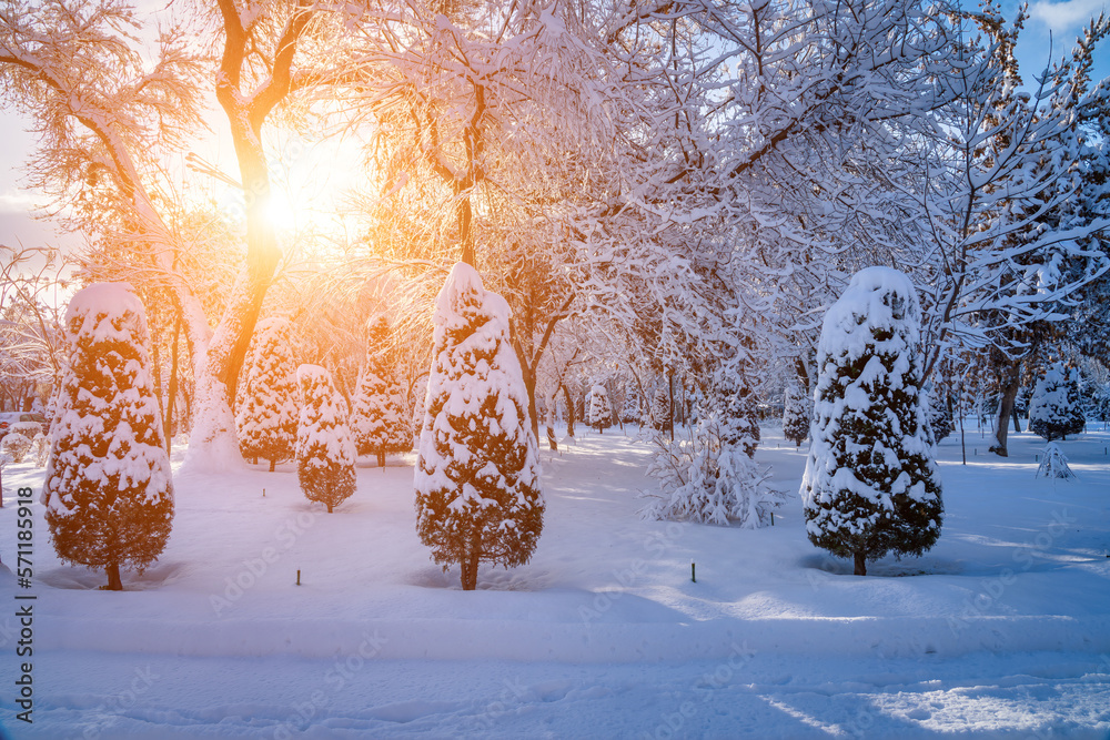 Sunset or dawn in a winter city park with trees covered with snow and ice.