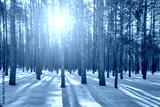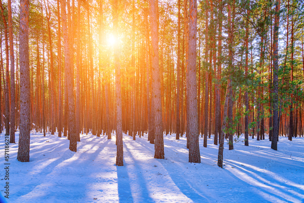 Sunset or sunrise in the spring pine forest covered with a snow. Sunbeams shining through the tree trunks.