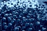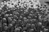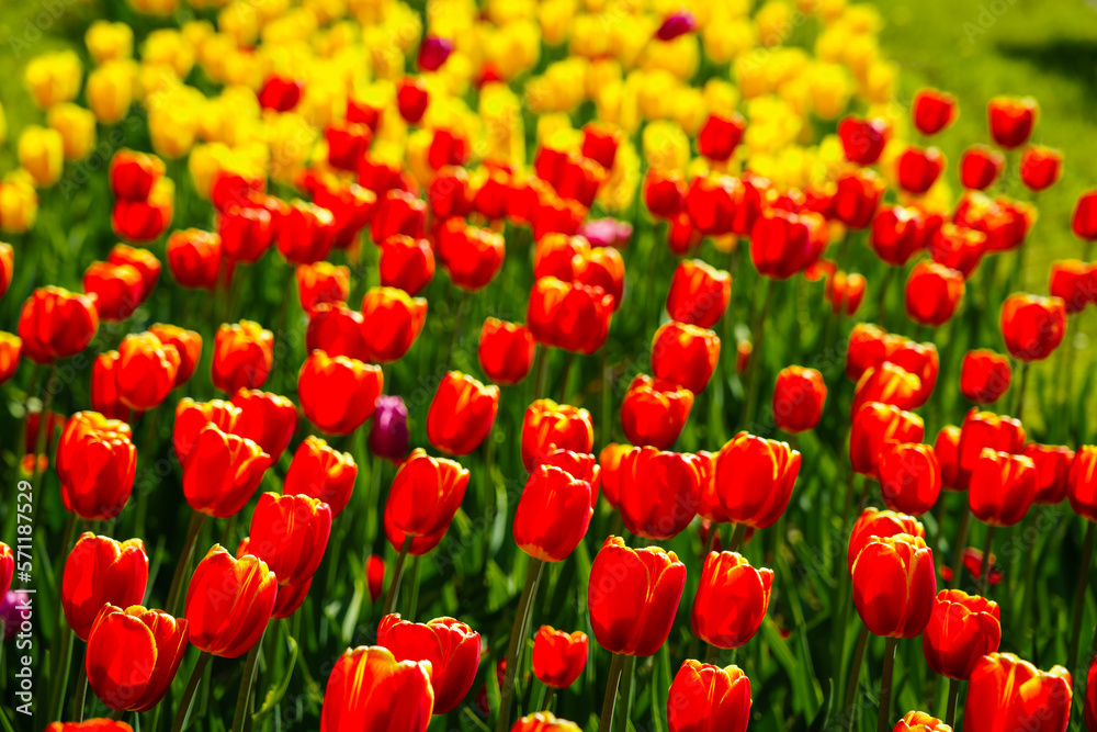 Red and yellow tulips lit by sunlight on a flower bed. Landscaping.