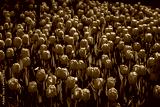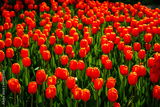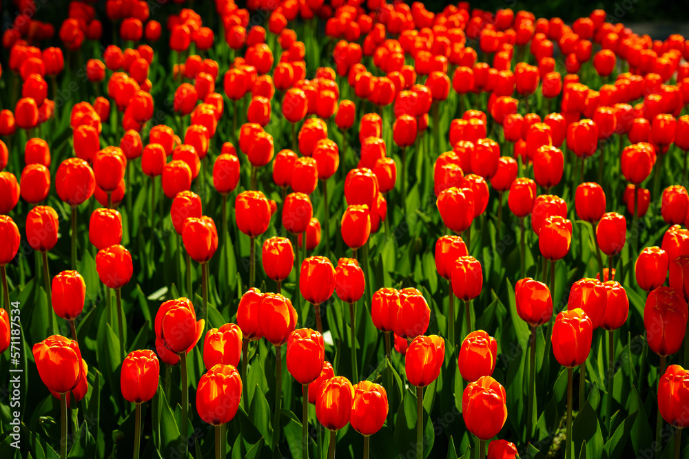 Red tulips lit by sunlight on a flower bed. Landscaping.