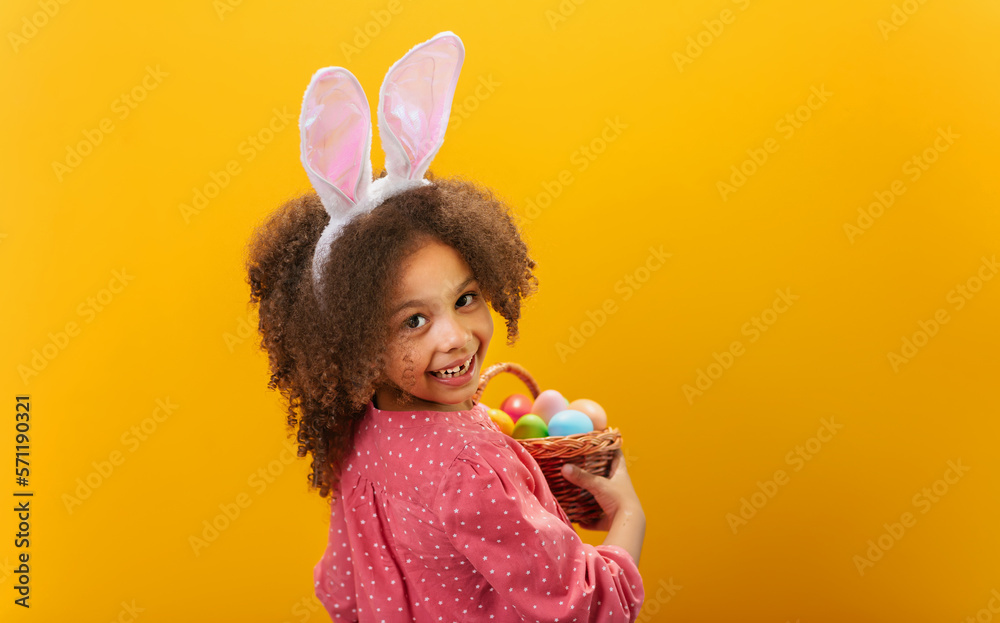 A Black girl with rabbit ears on her head with a basket full of colored eggs.