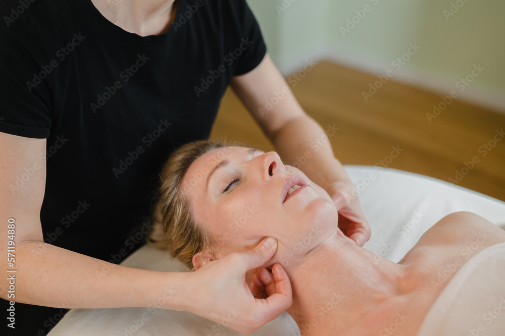 Therapeutin behandelt junge Frau am Kiefer mit Schmerzen in den Faszien ganzheitlich