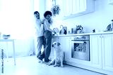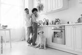Positive african american couple washing plates and looking at labrador dog in kitchen.