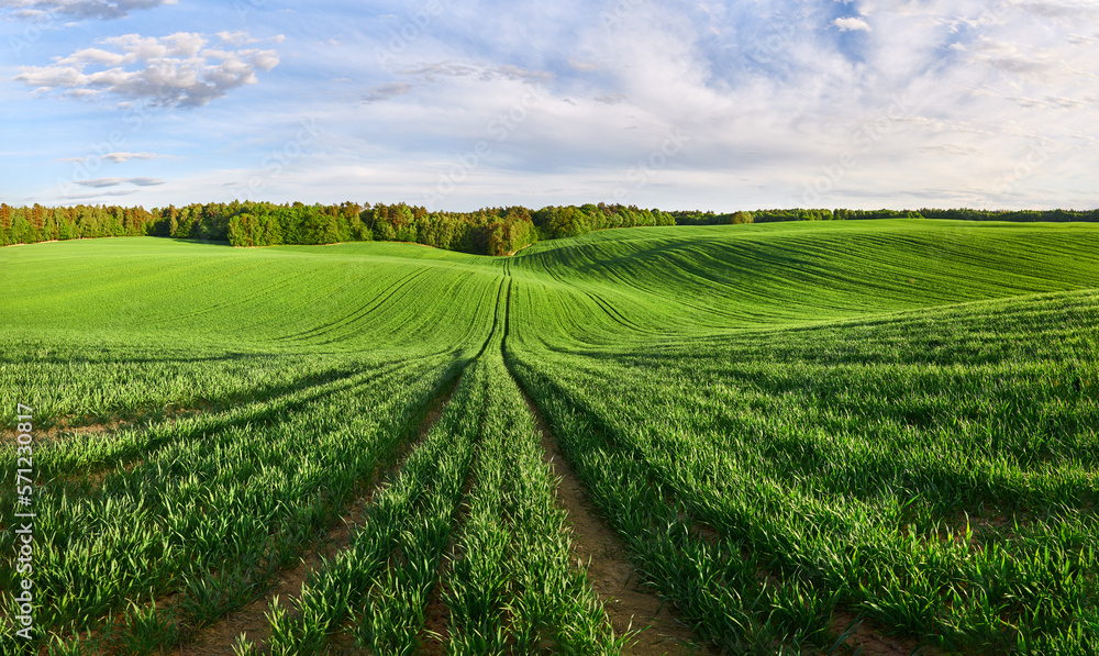 Panorama of a green ecological wheat field at the edge of the forest