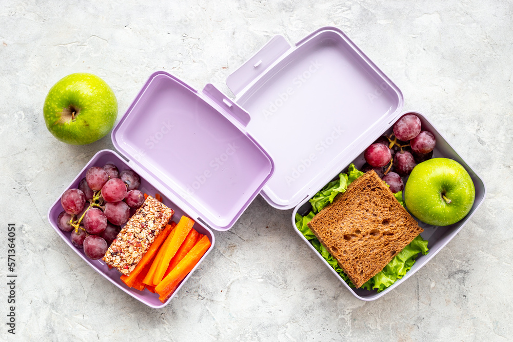 Healthy lunch boxes with sandwich and fruits. Healthy school meal
