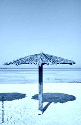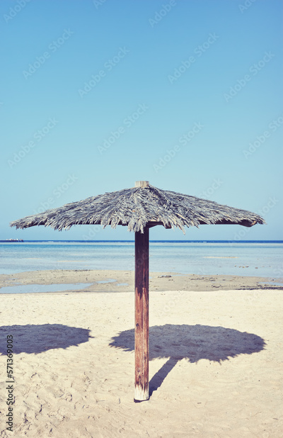 Tropical beach with wooden umbrella, color toning applied, selective focus.