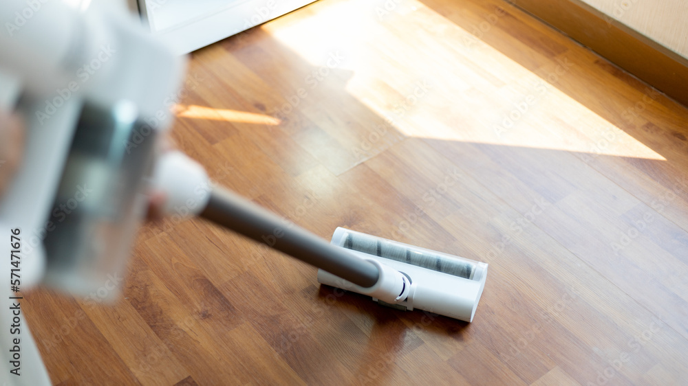 Woman vacuuming the floor of her living room, Big cleaning in the house, Removes germs and dirt and deep stains, Housewife cleaning, Keeping her home clean, Domestic hygiene.