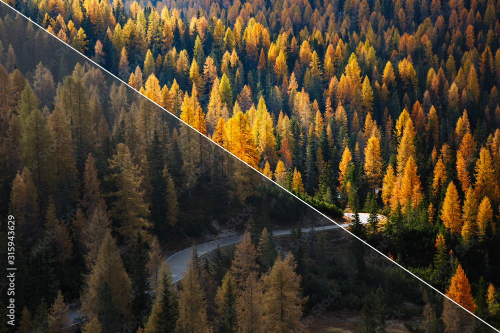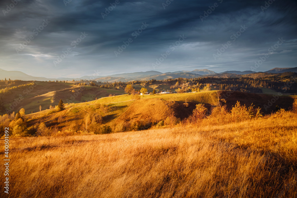 Morning view of forested mountains and spruce trees. Carpathian mountains, Ukraine.