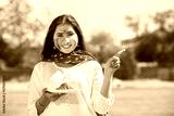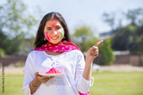 Portrait of happy young Indian woman wearing white kurta and dupatta outfit holding powder color plate pointing at blank space celebrating holi festival at park, Face painted with colorful gulal