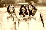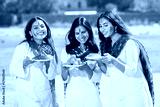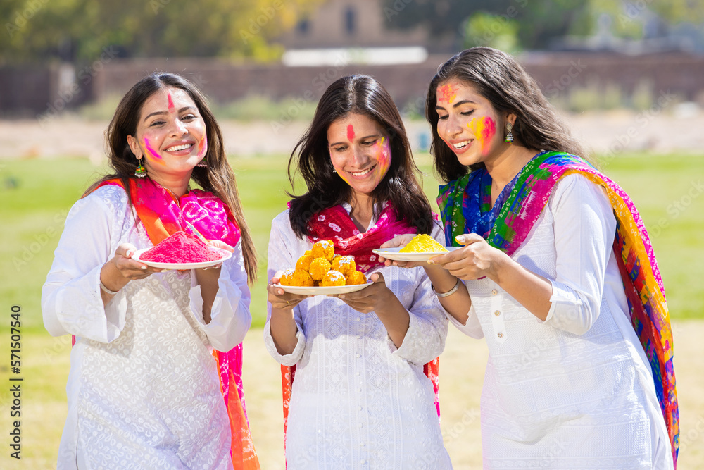 Group of happy young indian woman wearing traditional white dress celebrating holi festival at park while holding plates full of gulal, adult girls having fun with colorful powder.