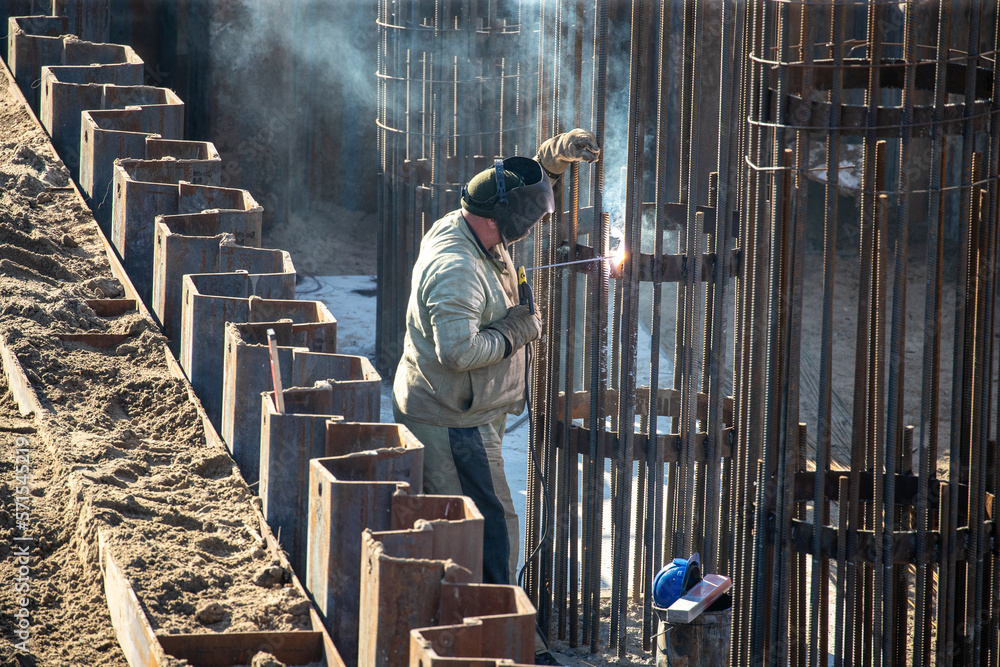 Welder outdoors welds steel with welding fumes. Harm to the health of the welder will cause inhalation of smoke when welding steel.