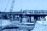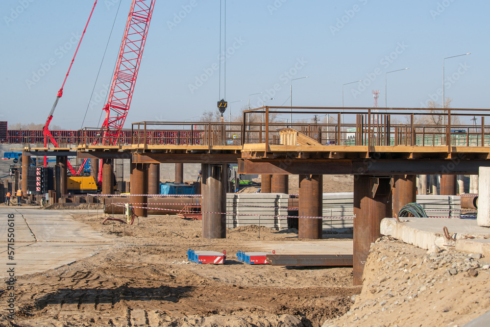 The mobile crane is loading the cargo. View of the construction site with machinery, people at work. Construction of a bridge on a local road, a new road bridge