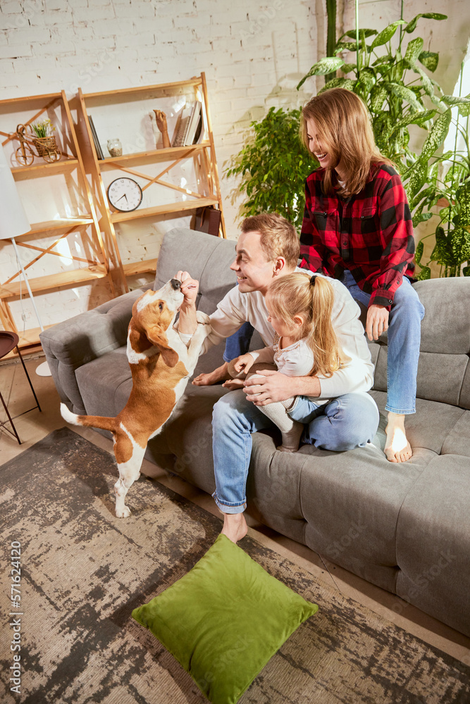 Happy, cute, lovely family with kid spending time together on warm sunny day at home. People playing with dog, beagle in living room at home. Relationship, family, parenthood, childhood, animal life