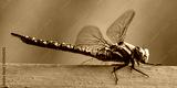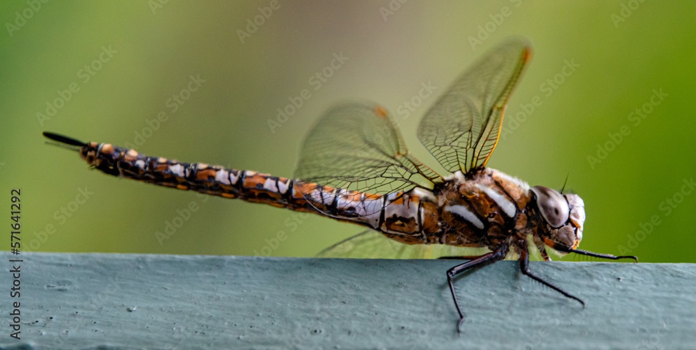 Close Up Macro Shot of Dragonfly on Metal Railing Blurred Background