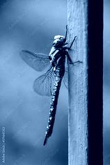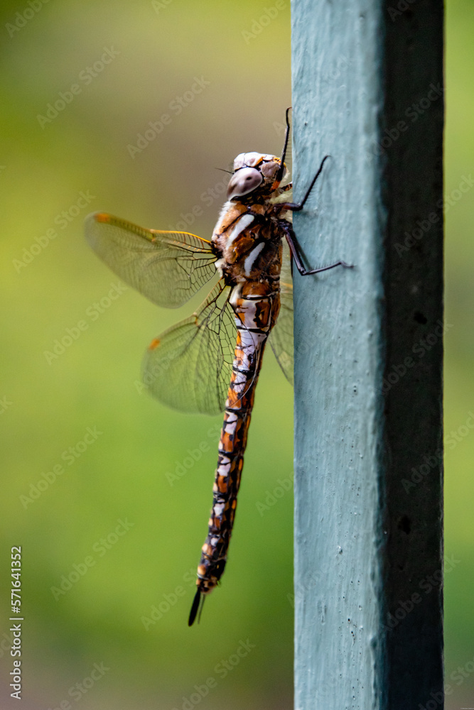 Close Up Macro Shot of Dragonfly on Metal Railing Blurred Background