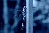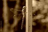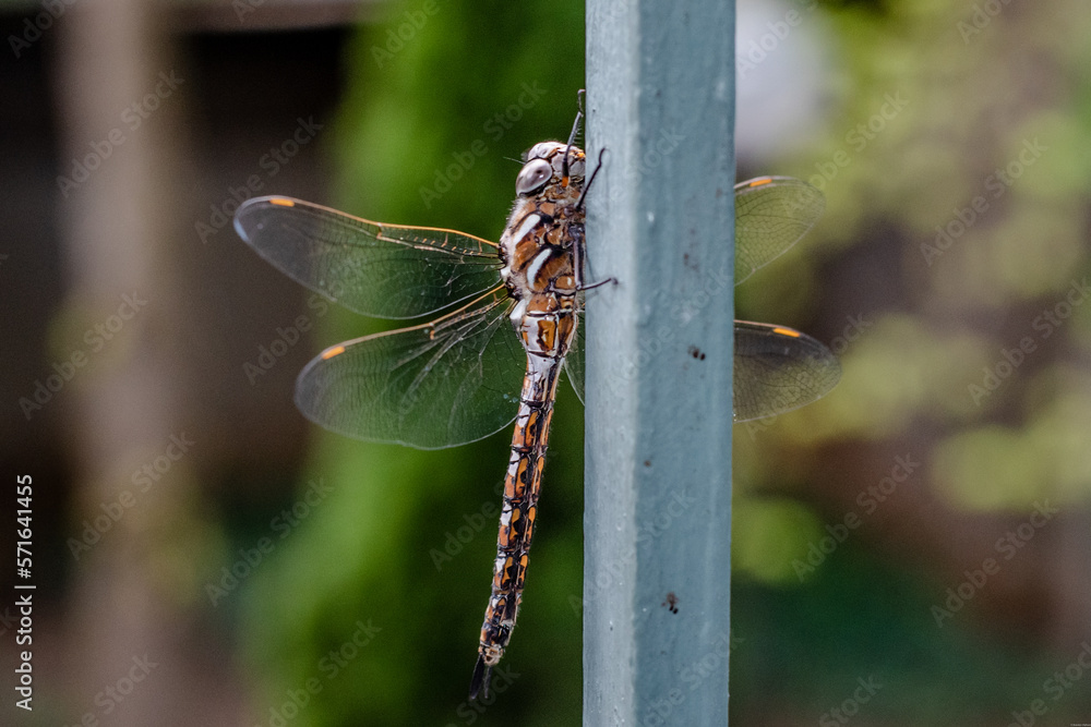 Close Up Macro Shot of Dragonfly on Metal Railing Blurred Background
