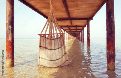 Hand woven natural fiber hammock under a pier, selective focus, color toning applied.