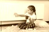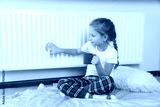 Little girl with cup of hot drink near heating radiator indoors
