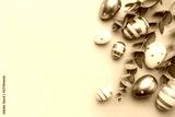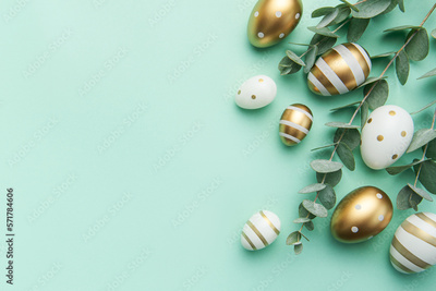 Easter eggs painted in gold and eucalyptus branches on a soft green background.
