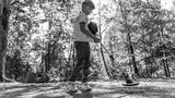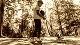 serious boy with a metal detector examines the soil on a rocky trail on a summer evening