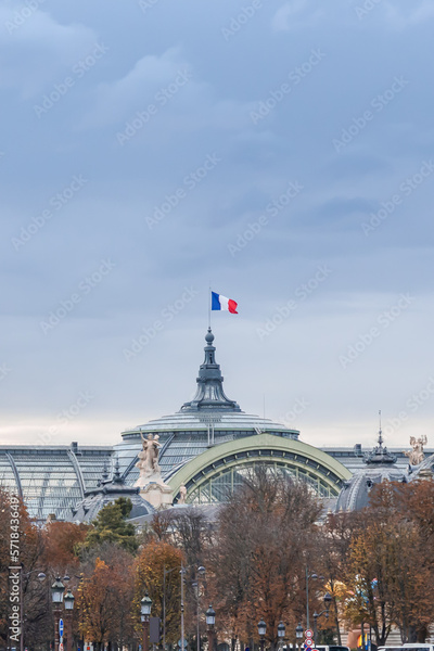 Roof of the Grand Palais with a French flag waving in the air in Paris, France in Autumn