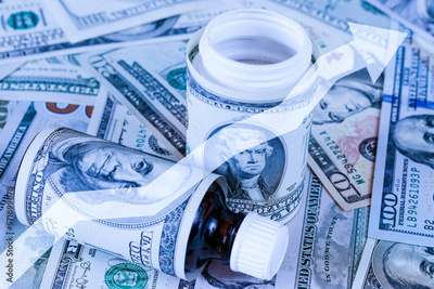 Bottle of drug or vitamin with dollars and arrow up. The concept of growth in the production of medicine pills or prices for them. Growth in sales, demand and purchases.