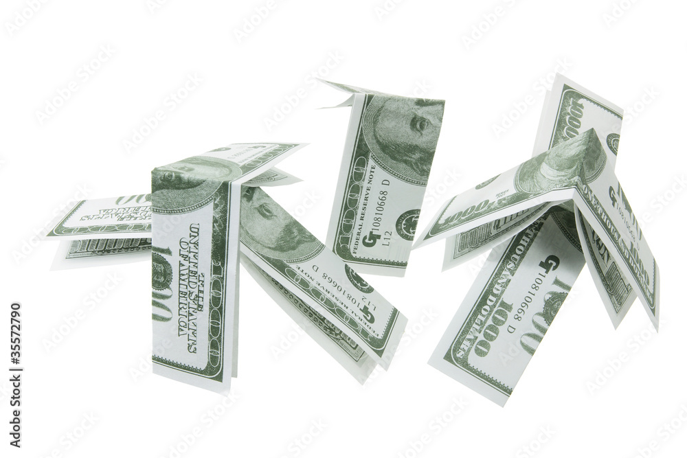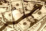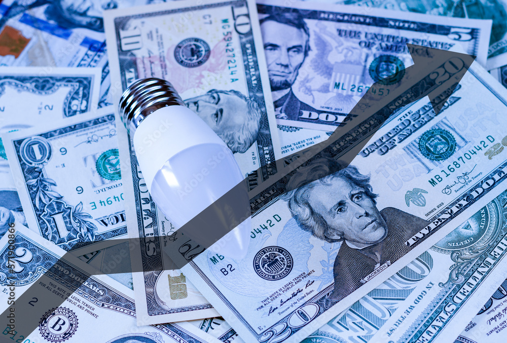 LED lamp on dollar bills background and arrow up. The concept of growth of prices for electricity.
