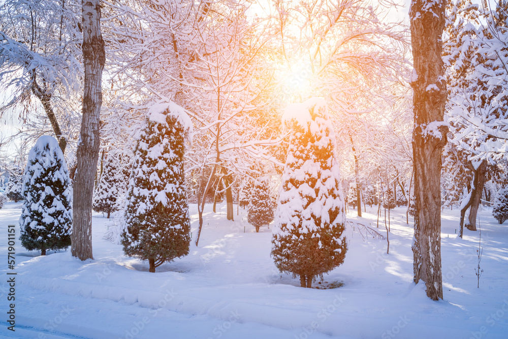 Sunset or dawn in a winter city park with trees covered with snow and ice.