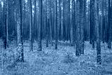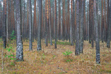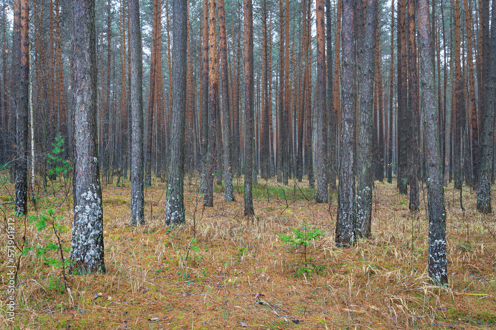 Pine autumn misty forest. Rows of pine trunks shrouded in fog on a cloudy day.