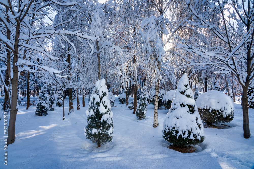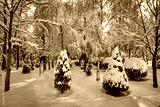 Sunset or dawn in a winter city park with trees covered with snow and ice.