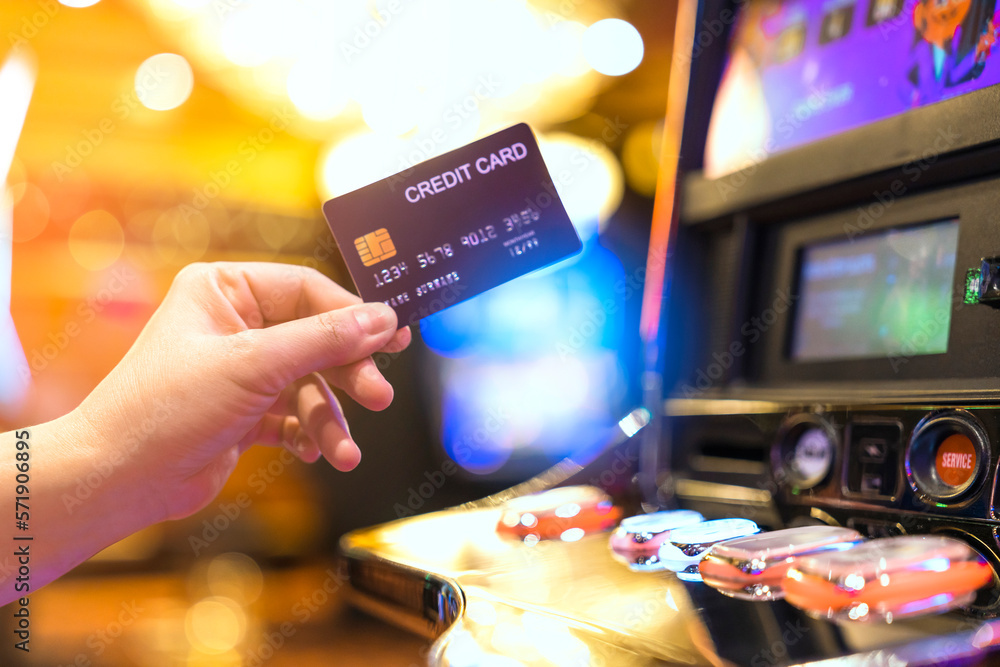 Slot Machine gambling bet Play Time. Female Gambler Hand hold credit card ready to win the game with one best shot casino close up female Hand holding credit card playing slot machine gambling closeup