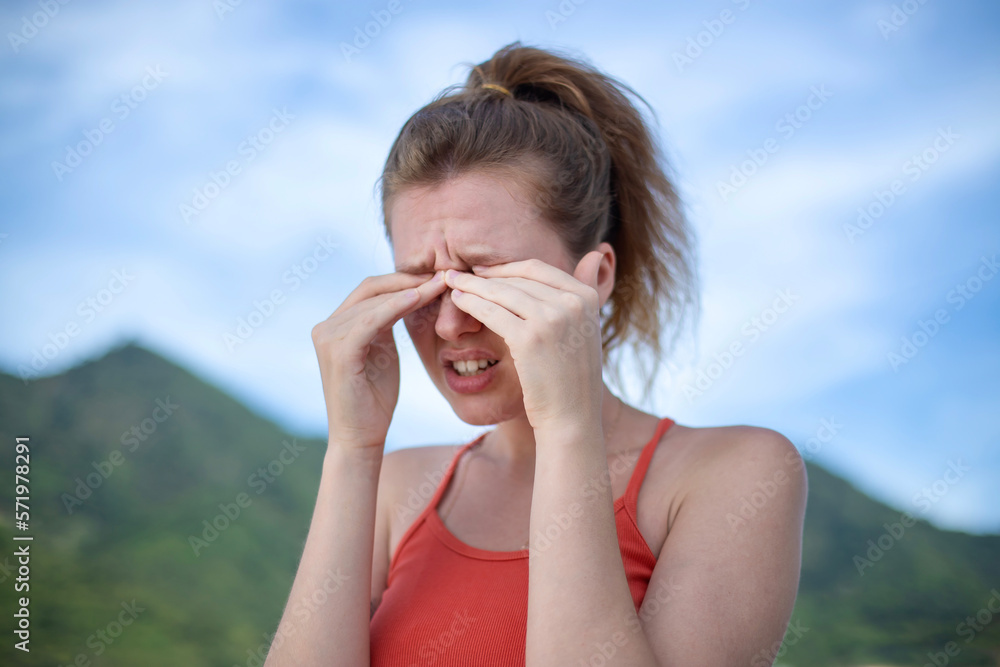 Close up of a woman scratching itchy and rub eyes with her hands in a park, problems with vision, allergy