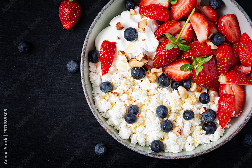 Cottage cheese, curd cheese with fresh strawberries, blueberries, nuts and yogurt in a bowl. Healthy dairy product rich in calcium and protein. Top view, above