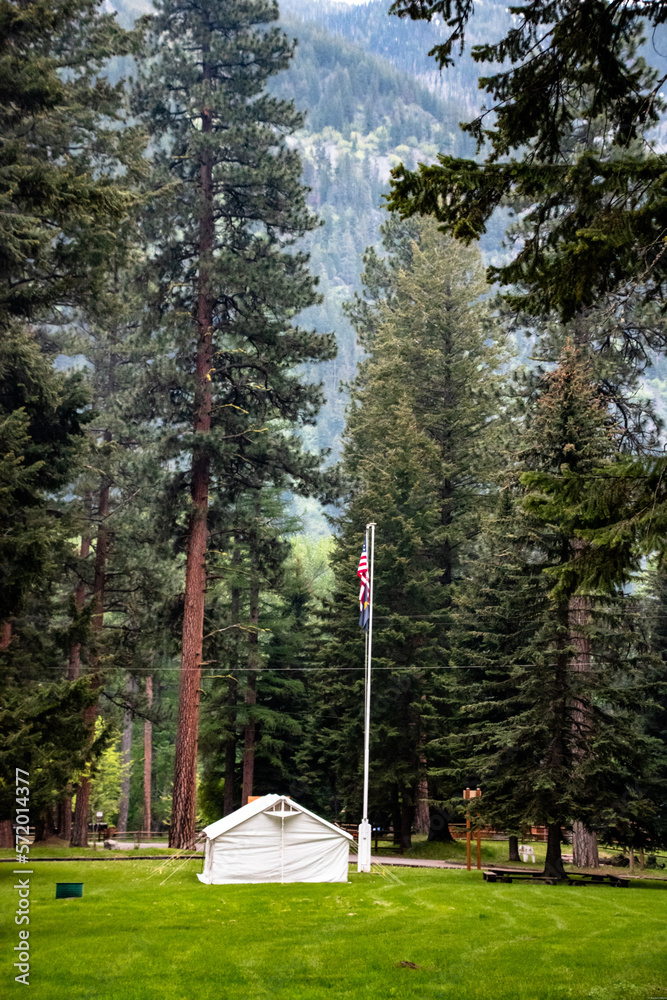 White Camping Tent Under American Flag in Forest in Wallowas, OR
