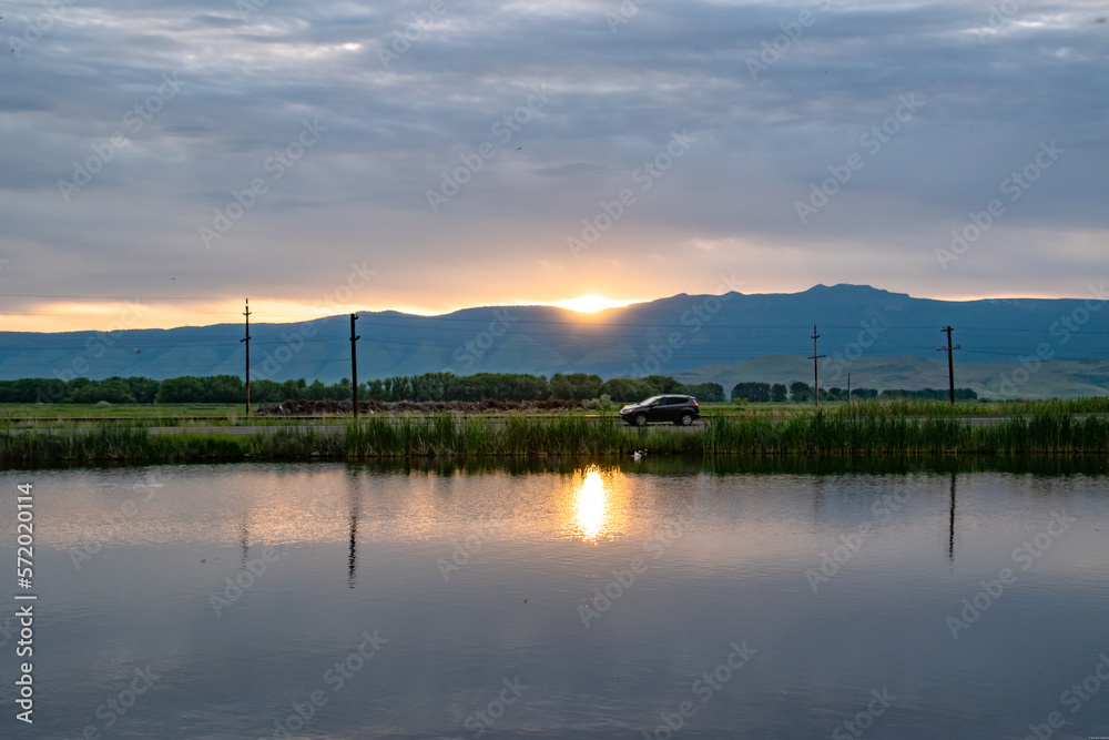 Sunrise Peaking Over Wallowa Mountain Range Reflecting Off Rural Lake in Eastern Oregon